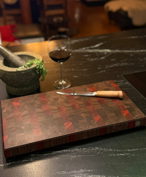 Hirnholzschneidebrett aus Buche & Schwarznuss – Eleganter Randabschluss -