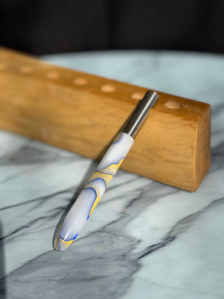 Dieser handgefertigte Flaschenöffner aus Epoxidharz bringt Farbe und Leichtigkeit in den Alltag. Die lebendige Kombination aus Blau- und Gelbtönen erinnert an sommerliche Tage und macht jedes Stück zu einem echten Blickfang.