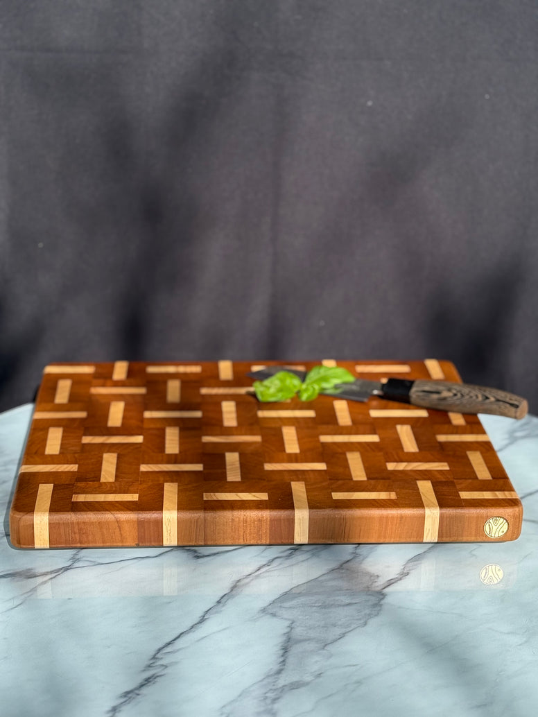 Dieses massive Hirnholz-Schneidebrett aus edlem Teakholz und Ahornholz vereint handwerkliche Präzision, außergewöhnliche Haltbarkeit und ein besonders exklusives Erscheinungsbild. Das markante Muster entsteht durch die Kombination zweier hochwertiger Hölzer und macht jedes Brett zu einem echten Einzelstück in der Küche.