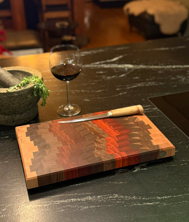 Dieses Hirnholz-Schneidebrett aus Schwarznuss, Padouk und Buche vereint markantes Design mit kompromissloser Funktionalität. Die hochwertige Holzkomposition, die massive Hirnholzbauweise und die sorgfältige Verarbeitung machen es zu einem langlebigen Küchenbegleiter für alle, die Wert auf Qualität, Charakter und echtes Handwerk legen.