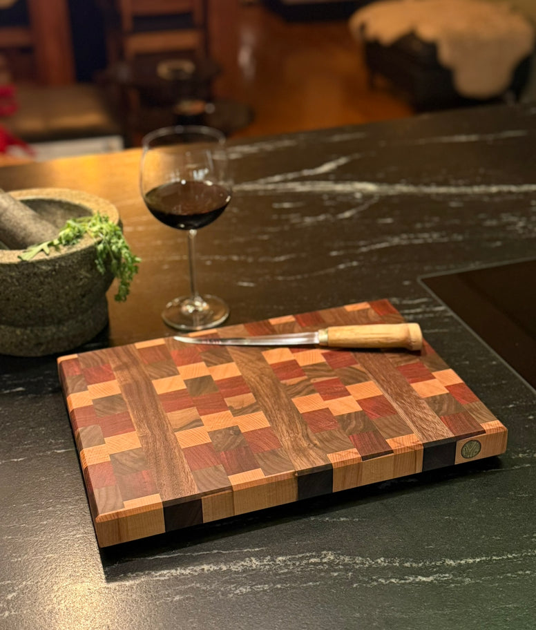 Eine gelungene Verbindung aus präziser Handarbeit, durchdachter Funktion und markanter Holzgestaltung – dieses handgefertigte Hirnholz-Schneidebrett aus Schwarznuss, Buche und Padouk überzeugt durch seine klare Form und seine hochwertige Verarbeitung. Entworfen für den täglichen Einsatz ebenso wie für besondere Kochmomente, vereint es Ästhetik, Stabilität und exzellente Schneideigenschaften.